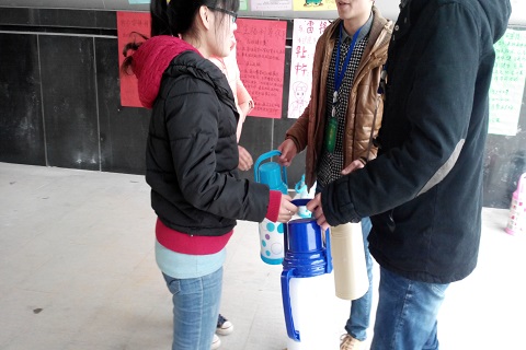 此次活动形式新颖有趣,引来了众多同学的积极参与。女同学们积极地将自己的水壶整齐地摆放在服务台前,男同学们则踊跃地提起空壶,有秩序地走到水房,细心地为女同学们打水,并把打好的热水送回到寝室楼下。从男生手中接过水壶的女同学深深地沉浸在幸福、开心和感动的快乐中。并纷纷感慨:“有了男生们的守护,我们不会再孤单。我们永远都是相亲相爱的一家人。”
