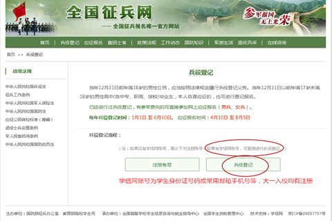 接红旗区人武部紧急通知,省教育厅及省军区司令部每周会对各院校的兵役登记情况进行排名。因此,各院系需在6月10日前完成我校在校生及毕业生兵役登记工作,务必保证在校男生及应届毕业男生符合条件者,兵役登记率达到100%。学生可进行兵役登记及报名后,将后台报名表格打印下来(并不意味着要征兵),作为进行兵役登记的证明材料,交给院系辅导员老师。辅导员老师汇总名单,报于院系就业专干,就业专干于每周四下午下班前,将院系登记情况报于就业卢慧莹处。
