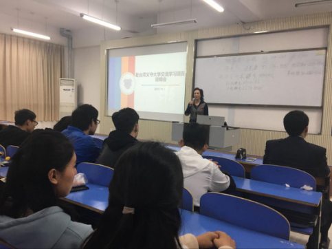 2017年11月1日晚上,健康管理学院“赴台交流学习项目说明会”在平原校区B201教室顺利举行,健康管理学院院长胡惠华、党总支书记贾臻、外事部、德馨书院、崇德书院以及健康管理学院部分师生近200人参加了说明会。会议由健康管理学院副院长陈东明主持。
