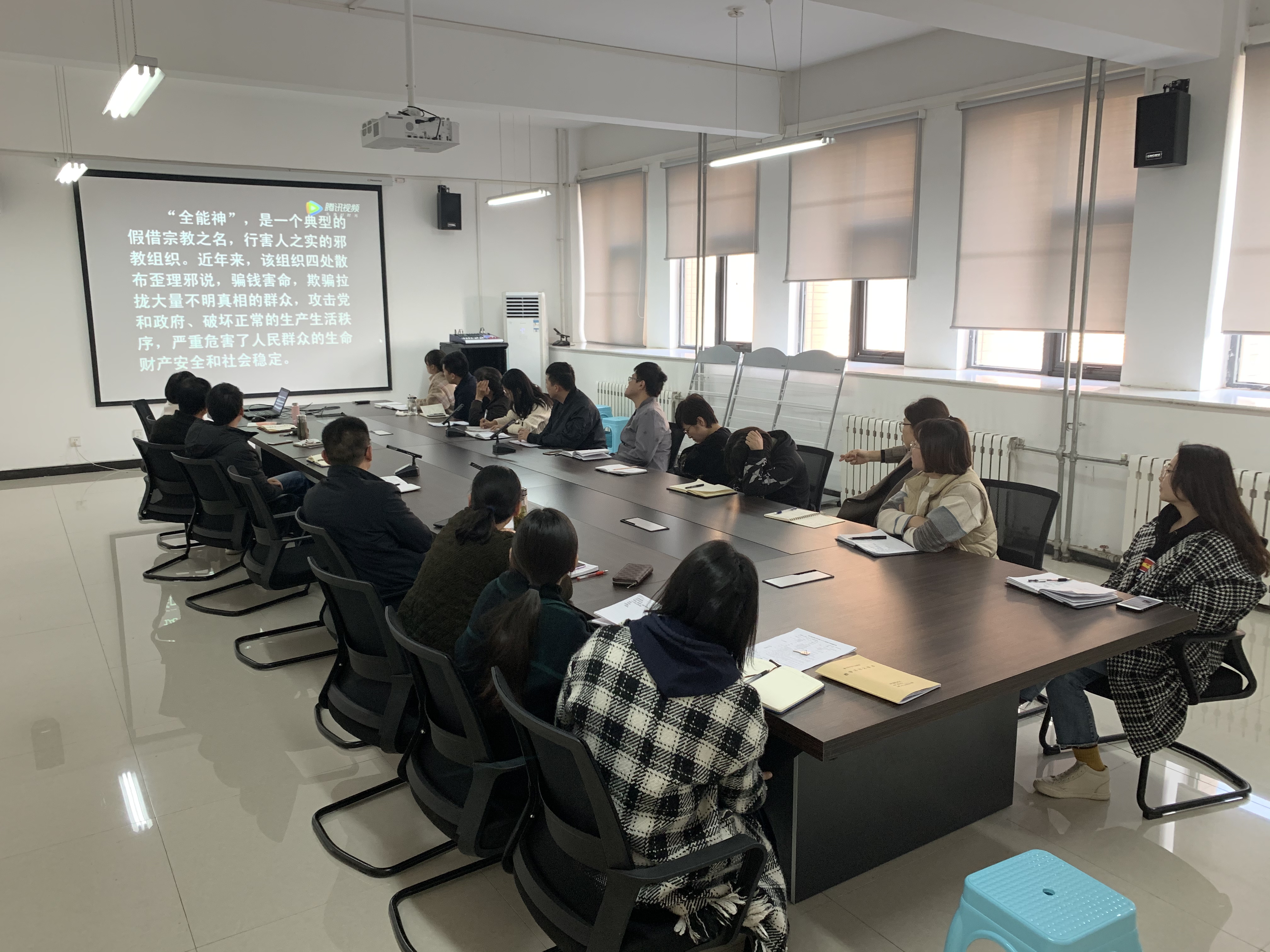 11月19日下午,健康管理学院全体教师在行政楼二楼会议室开展民族宗教知识讲座,本次讲座主要组织大家集中学习了民族宗教知识的重要意义、我国民族政策以及我国的宗教政策,并集体观看了《反邪教全能神》视频。