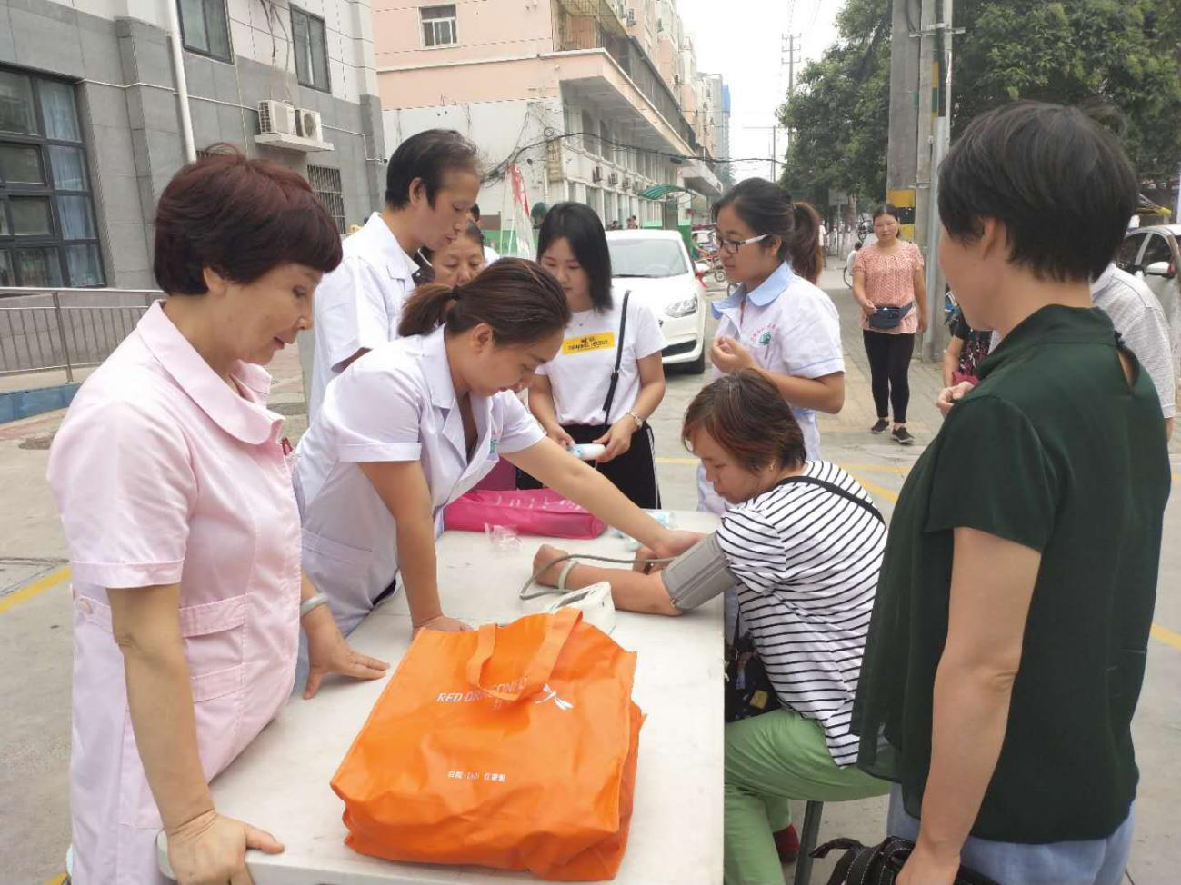在活动现场为社区居民、过往行人发放健康宣传手册,宣传主要针对科学健康观、膳食指南、慢性病防治等几个方面进行了详细讲解,引导居民群众进行健康义诊,请荣校社区卫生服务站医务人员为辖区群众设立糖尿病咨询服务,免费提供测血压血糖活动,为高血压患者建档提供针对性服务。