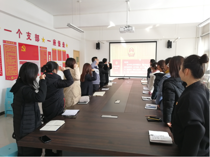 首先,全体党员集体诵读了《宪法》序言部分。党总支书记贾臻指出,《宪法》序言记载了我国的新民主主义革命的发展历程和社会主义建设等重大历史事件,既总结了历史经验,也为我国社会主义的发展方向指明了道路,明确了奋斗目标。同时,《宪法》序言明确了实现国家根本任务的基本原则,写明宪法是国家的根本法且具有最高的法律效力,全国各族人民、一切国家机关和武装力量、各政党和各社会团体、各企业事业组织,都必须以宪法为根本的活动准则,为宪法的解释、适用和遵守提供了背景和依据。因此,全体党员都应该认真学习宪法,认真领会、学习和贯彻习近平法治思想,坚定不移走中国特色社会主义法治道路。