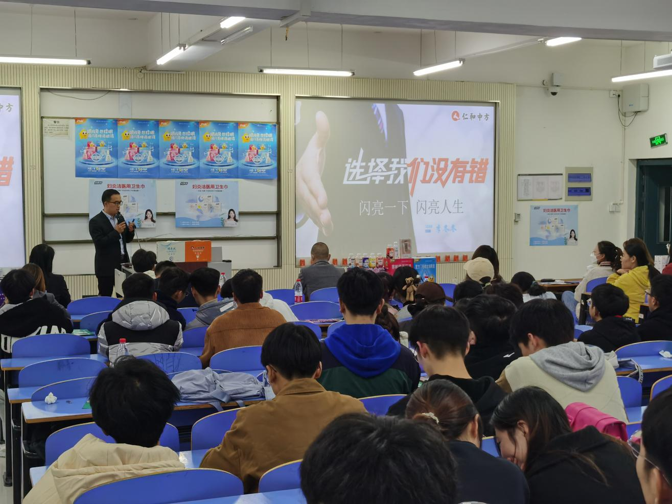 首先,由健康管理学院市场营销教研室王田田老师针对比赛流程,策划书的撰写等方面专业知识进行了详细介绍。产品介绍环节,第一部分由仁和妇炎洁负责人讲述仁和药业大健康系列产品,并通过实验对比展示械字号卫生巾与其他品牌卫生巾的区别,让同学们对妇炎洁卫生巾有了很大程度的了解。第二部分由江西中进药业有限公司代表介绍其所带来的仁和壹號植物饮料,并对其两款饮料所针对的不同人群和不同功效进行了详细讲解。第三部分由仁和中方医药股份有限公司代表介绍其产品“闪亮滴眼液”,针对两款颜色的滴眼液的不同功效进行了区分。