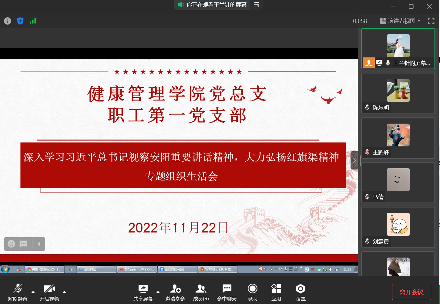 根据学校要求,严格执行党的组织生活制度,深入学习贯彻党的二十大精神和习近平总书记视察安阳重要讲话精神,健康管理学院党总支职工第一党支部于11月22日在企业微信群开展组织生活会,会议由职工第一党支部书记陈东明主持,一支部全体党员参会。
