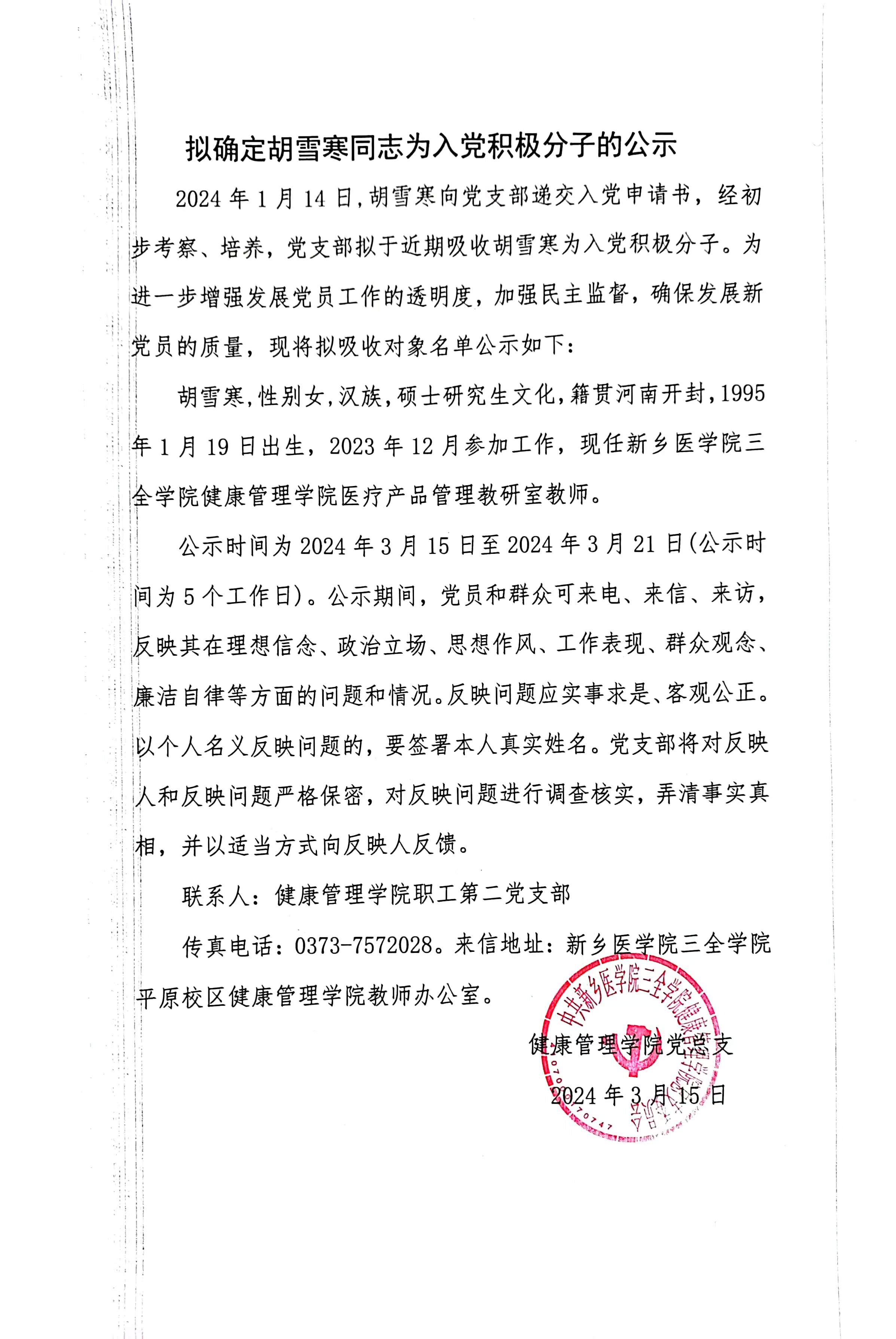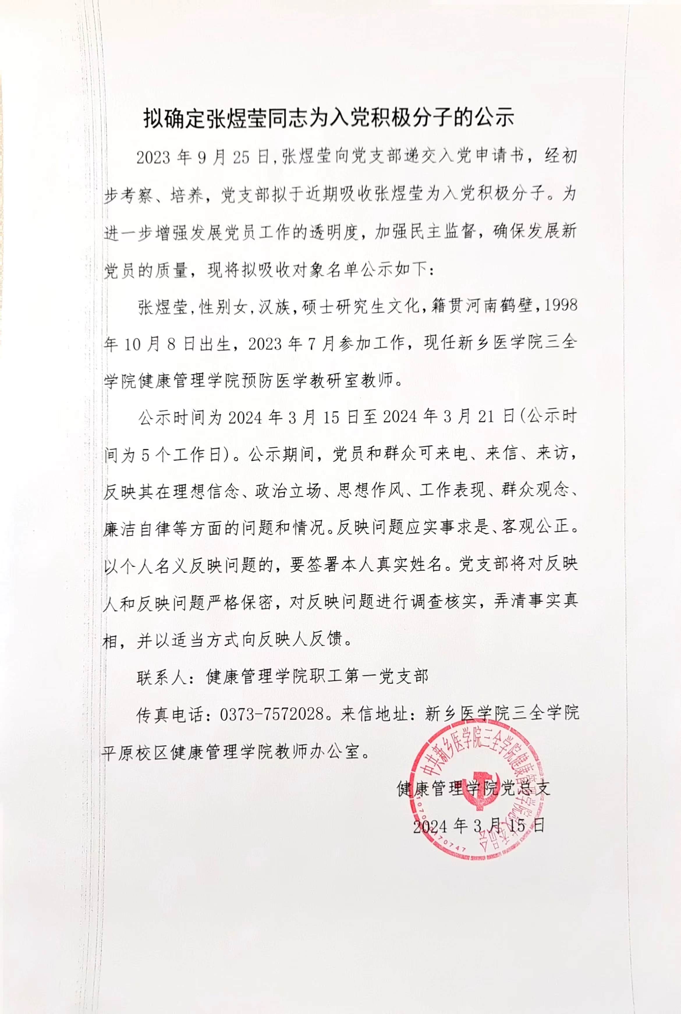 健康管理学院教师张煜莹、胡雪寒向党支部递交入党申请书,经初步考察、培养,党支部拟于近期吸收张煜莹、胡雪寒为入党积极分子。为进一步增强发展党员工作的透明度,加强民主监督,确保发展新党员的质量,现将拟吸收对象情况公示如下: