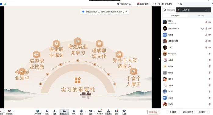 陈东明首先结合实习阶段的特点,对学生进行了安全教育。主要从网络安全、个人信息保护、意识形态安全、消防安全、交通饮食安全等方面提醒大家在外练就技能本领的同时要注重人身安全,安全是我们一切的根本。其次,他结合党的二十届三中全会关于大学生实习就业的论述,从高质量充分就业促进机制、精准就业指导服务、重点群体就业等方面进行阐述。最后,以实习的重要性为点,从检验专业知识、培养职业技能、探索职业规划、增强就业竞争力、理解职场文化、丰富个人履历等方面进行一一交流。