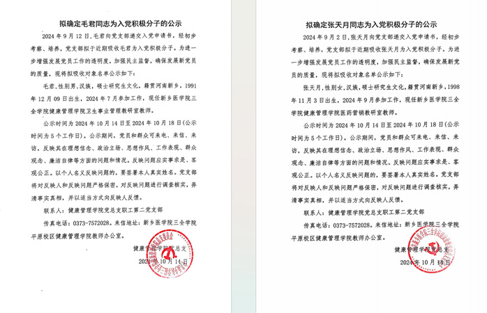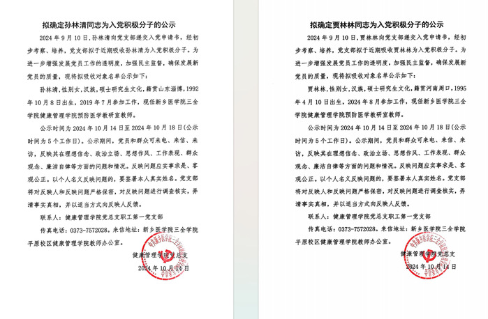 健康管理学院教师孙林清、郭林楠、贾林林、曹婷婷、张天月、王宁、毛君7名同志向党支部递交入党申请书,经初步考察、培养,党支部拟于近期吸收孙林清等7名同志为入党积极分子。为进一步增强发展党员工作的透明度,加强民主监督,确保发展新党员的质量,现将拟吸收对象情况公示如下: