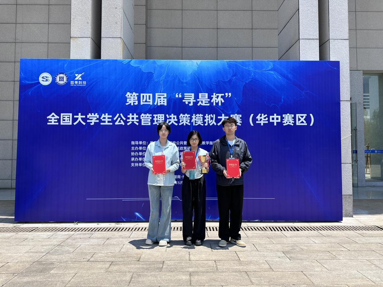5月9日至11日,第四届“寻是杯”全国大学生公共管理决策模拟大赛(华中赛区)在湖南省长沙市中南大学公共管理学院举行。我院由程涵、杨静雅老师指导及王璐璐老师带队的2023级公共事业管理专业3名学生贾鑫雨、李明喆、李淑珂组队代表学校参赛,与来自全国众多高校的选手同台竞技,最终获得大赛二等奖。