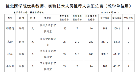 为表彰奖励在教书育人、科学研究、社会服务等工作中涌现出来的优秀教师典型,充分发挥榜样引领作用,根据《豫北医学院优秀教师、优秀实验技术人员评选与奖励办法》等文件要求,结合健康管理学院本年度工作情况,于2025年8月29日至8月31日开展了2024-2025学年优秀教师评选工作,根据《专业技术职务评审业绩量化办法》,参评人员业绩量化及支撑材料经院系初审,定量得分以及排名详情特此公示。公示期为2025年9月1日至9月2日。