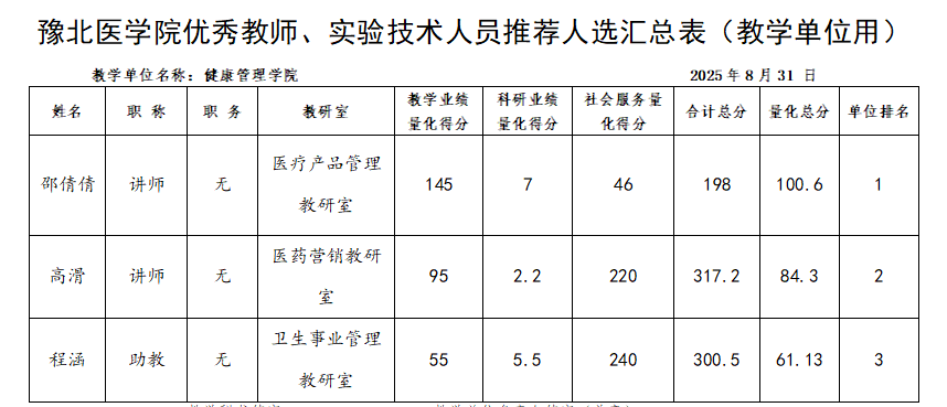 健康管理学院2024-2025学年优秀教师量化得分公示