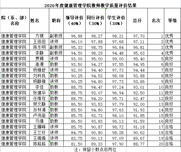 健康管理学院2020年度专业技术职务聘任业绩量化公示