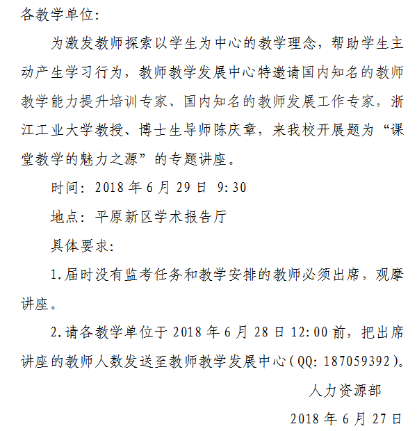 各位老师:为了我校教师教学工作水平的提高、教学方式的创新,我校特意举行教师教学工作培训,希望各位老师积极参加。现将有关事项通知如下:培训主题:《PBL案例教学》培训时间:2018年4月11日下午15:00...