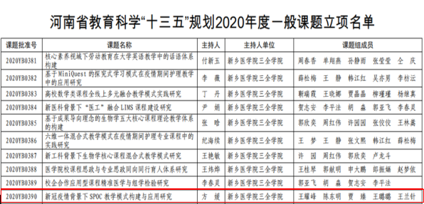 近日,河南省教育厅下发了《关于公布河南省教育科学“十三五”规划2020年度一般课题立项名单的通知》,我院方媛同志的《新冠疫情背景下spoc教学模式构建与应用研究》喜获立项,具体事项如下: